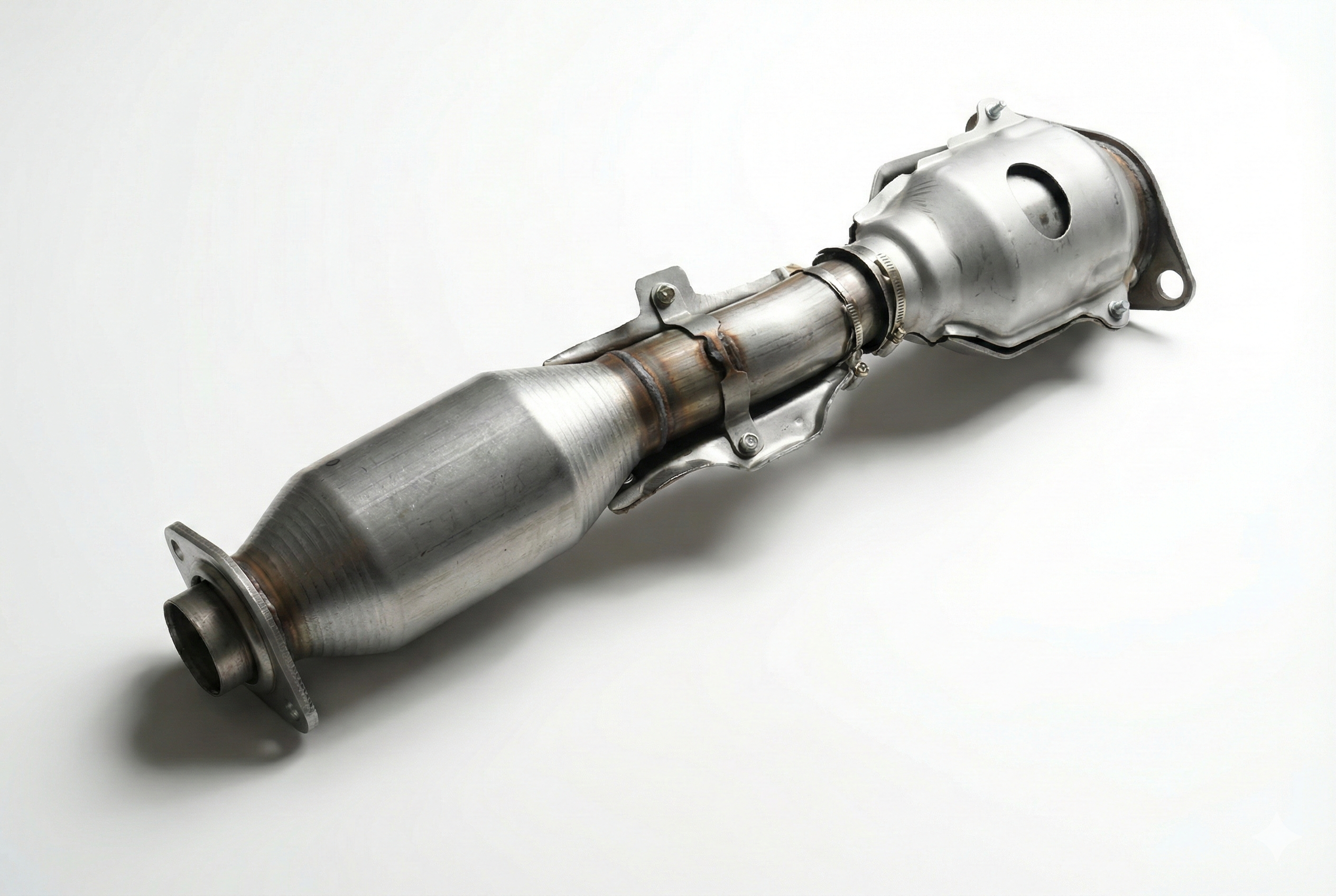 Универсальный металлический катализатор. Длина 415 мм, вход/выход ф 57мм. Плоский....